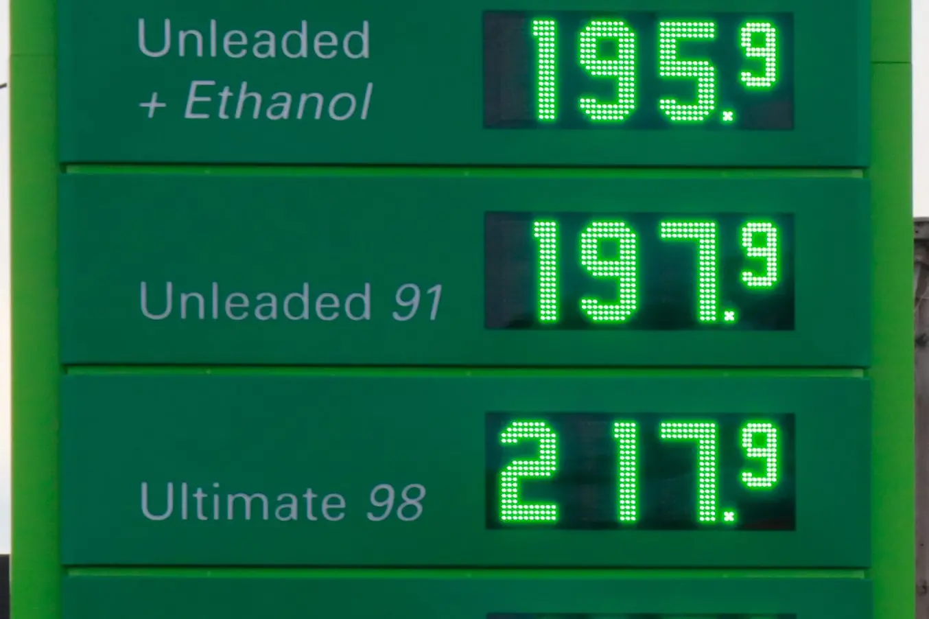 Now prices have levelled out with E10 back up to 195.9 and 197.9 cents per litre across most servos in town.