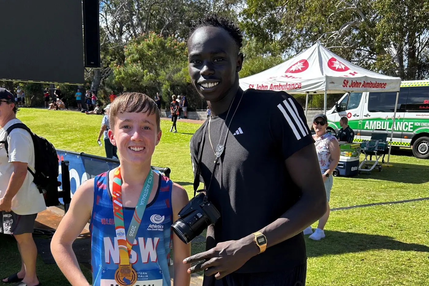As well as smashing records and winning medals Toby was also extremely happy to meet his idol Gout Gout and have a photo with him shortly after receiving his medal from Paralympian Jaryd Clifford.